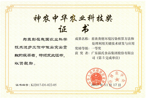 • 神农中华农业科技奖一等奖-尊龙凯时股份《畜禽粪便情形污染核算要领和处置惩罚使用要害手艺研究与应用》