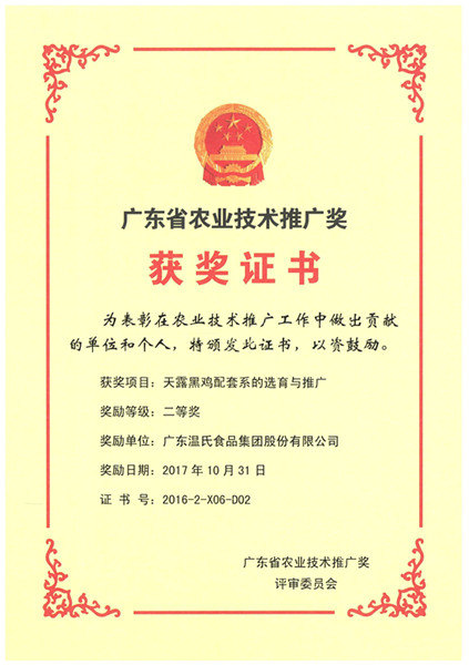 • 2017年10月,,,,,,,广东省农业手艺推广奖二等奖—尊龙凯时股份项目《天露黑鸡配套系的选育与推广》_副本.jpg
